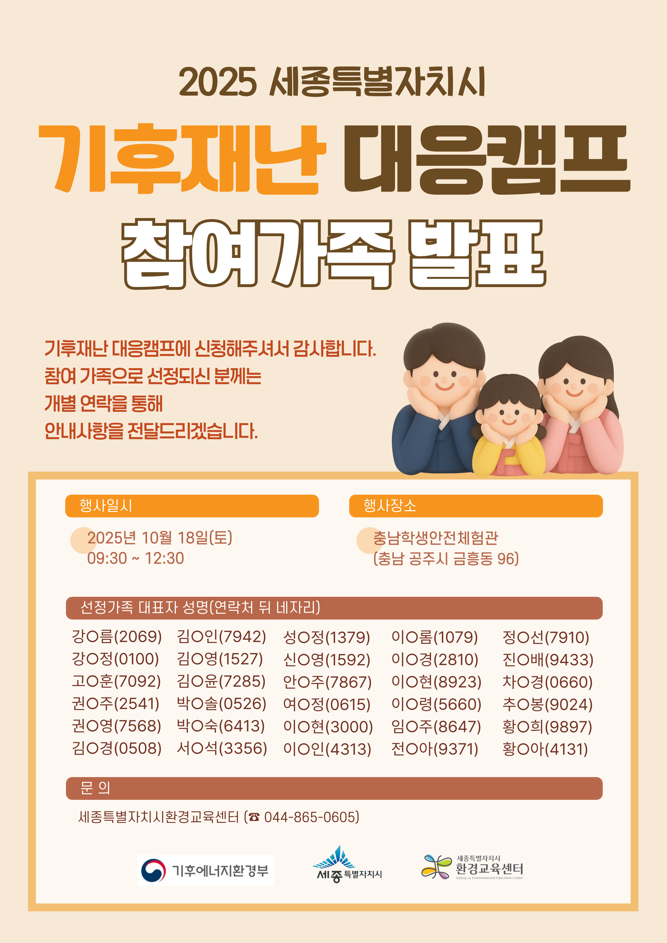 ![]() 2025 세종시 기후재난 대응캠프 참여가족 발표 기후재난 대응캠프에 신청해주셔서 감사합니다. 참여 가족으로 선정되신 분들께는 개별 연락을 통해 안내사항을 전달드리겠습니다. □ 행사개요 ◦ 행사명: 2025년 제1회 세종기후재난대응캠프 ◦ 일 시: 2025년 10월 18일(토) 09:30~12:30 ◦ 장 소: 충남학생안전체험관(충남 공주시 금흥동 96) ◦ 참여대상: 초등학생 자녀가 있는 세종시민 30가족(미취학 아동 참여 불가) ◦ 주최/주관: 환경부/세종특별자치시/세종특별자치시환경교육센터 ◦ 후원/협력: 세종특별차지시의회/충청남도교육청안전수련원 |