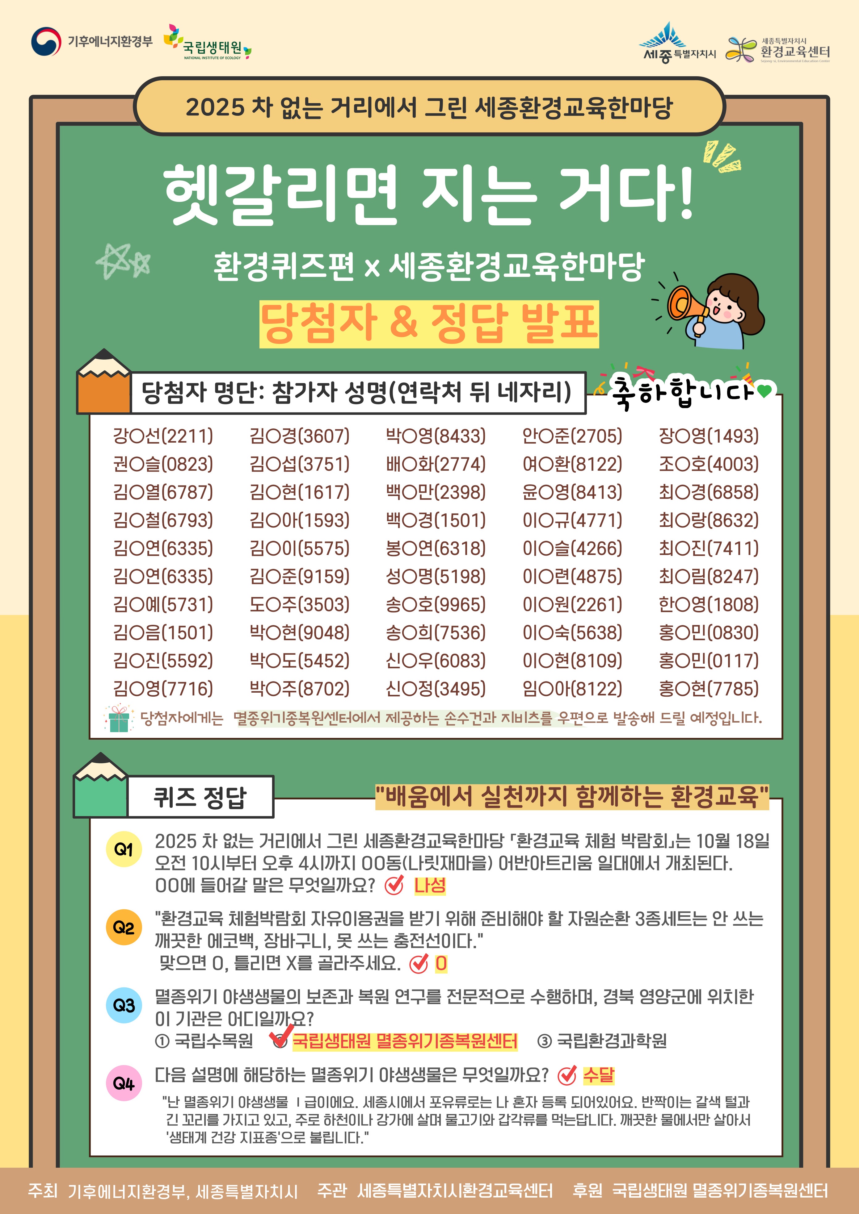![]() ○ 헷갈리면 지는 거다! 환경퀴즈편 X 세종환경교육한마당 당첨자&정답 발표 2025. 10. 1.(수) ~ 10. 18.(토) 동안 진행된 '헷갈리면 지는 거다! 환경퀴즈편 X 세종환경교육한마당'의 당첨자 및 정답을 발표합니다. 당첨자에게는 멸종위기종복원센터에서 제공하는 손수건과 지비츠를 우편으로 발송해 드릴 예정입니다. 참여주신 많은 분들께 진심으로 감사의 말씀 드립니다. |