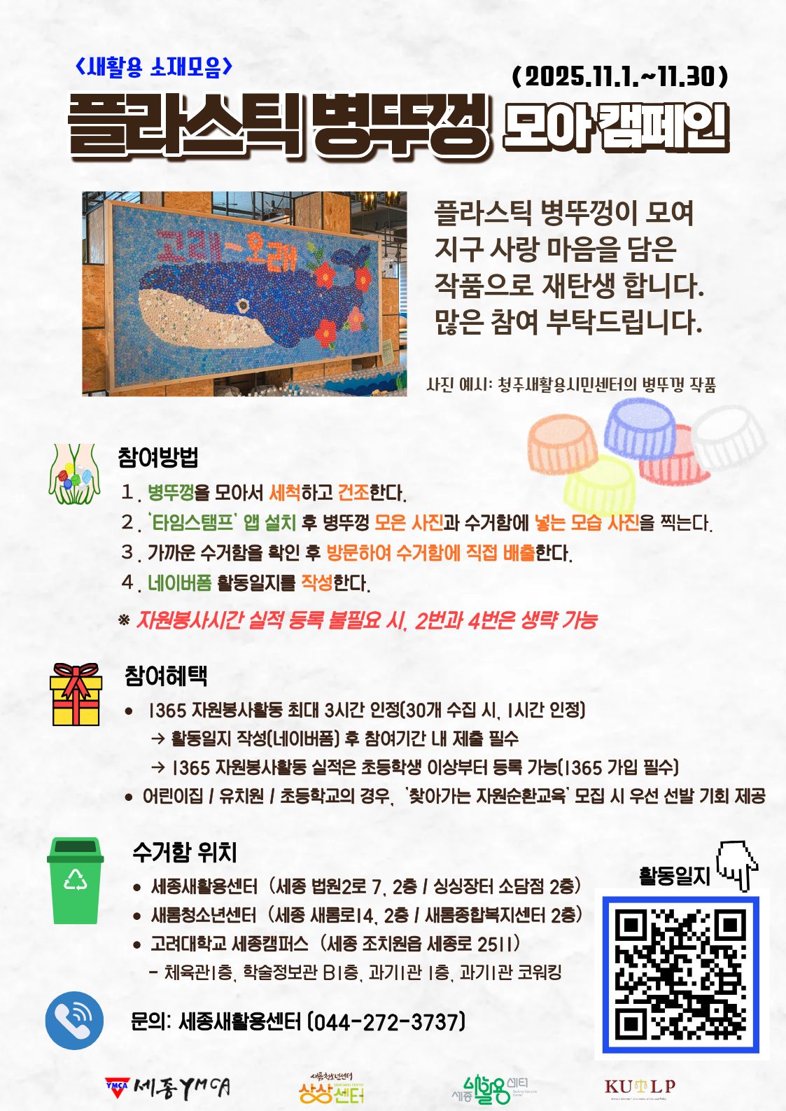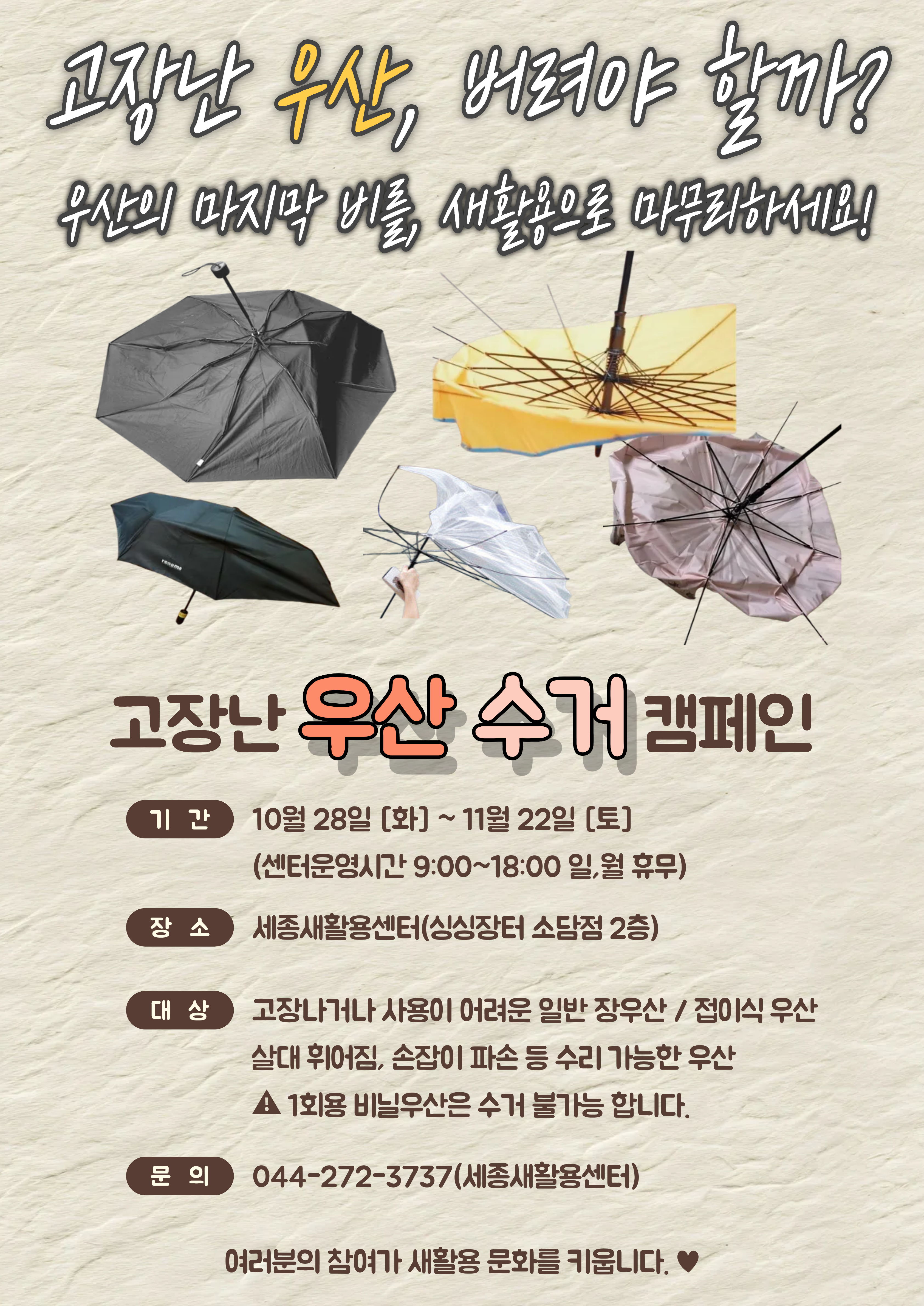 ![]() 1. 『우산수리 활동가 양성과정』 운영 안내 세종새활용센터에서는 고장난 우산의 수리법을 배우고 익혀, 자원순환도시 세종에서 활동하실 활동가 양성과정을 운영합니다. 양성과정 후 고장난 우산을 수리하여 다시 사용하고, 수리가 어려운 우산은 분해하여 새활용 제품으로 만들거나 다른 우산의 부품으로 사용하며 자원순환을 실천하고자 합니다. 관심 있는 분들의 많은 참여 부탁드립니다. → 신청링크 : https://naver.me/GDLs2dzq ○ 일시: 11월 25일 화요일 11:00-17:30 ○ 대상: 우산 수리에 관심이 있으며 교육 후 소모임에 참여가 가능한 세종 시민 (개별통보예정) ○ 장소: 세종새활용센터(싱싱장터 소담점 2층) 세미나실 ○ 참가비: 5천원 (점심식사 김밥 및 음료 제공) ○ 유의사항 : 교육일 기준 3일 전까지만 취소 및 환불이 됩니다. ○ 문의: 044-272-3737(세종새활용센터) 2. [새활용 소재모음] '고장난 우산 모음' 캠페인 ○ 기간: 10/28(화) ~ 11/22(토) ○ 장소: 세종새활용센터(싱싱장터 소담점 2층)에 방문하여 배출 (센터 운영시간: 9:00-18:00/ 일월 휴무) ○ 대상: 고장나거나 사용이 어려운 일반 장우산/접이식 우산 - 살대 휘어짐, 손잡이 파손 등 수리 가능한 우산 - 1회용 비닐 우산은 수리가 불가능 해 수거하지 않습니다. ○ 활용계획 - 우산수리 활동가 양성과정 중 연습용으로 사용 - 수리하여 공유 우산으로 사용 - 수리가 불가능할 경우, 추후 수리 부품으로 사용 ○ 문의: 044-272-3737(세종새활용센터) 3. [새활용 소재모음] '페트병 병뚜껑 모음' 캠페인 ○ 기간: 11/1(토) ~ 11/30(토) ○ 참여혜택: 1365 자원봉사활동 최대 3시간 인정(30개 수집시, 1시간 인정) ○ 참여방법 - 깨끗하게 씻고 건조한 병뚜껑을 지정된 수거함에 배출 - 활동일지(네이버폼) 작성 후 참여기간 내 제출하면 자원봉사활동 시간 인정 가능 (1365 자원봉사시간 미등록 시 활동일지 생략 가능) → 활동일지: https://naver.me/Fytuo7Fq ○ 수거함 위치 - 세종새활용센터(싱싱장터 소담점 2층) - 새롬청소년센터(새롬종합복지센터 2층) - 고려대학교 세종캠퍼스 (체육관1층, 학술정보관B1층, 과기1관 1층, 과기1관 코워킹) ○ 문의: 044-272-3737(세종새활용센터) |