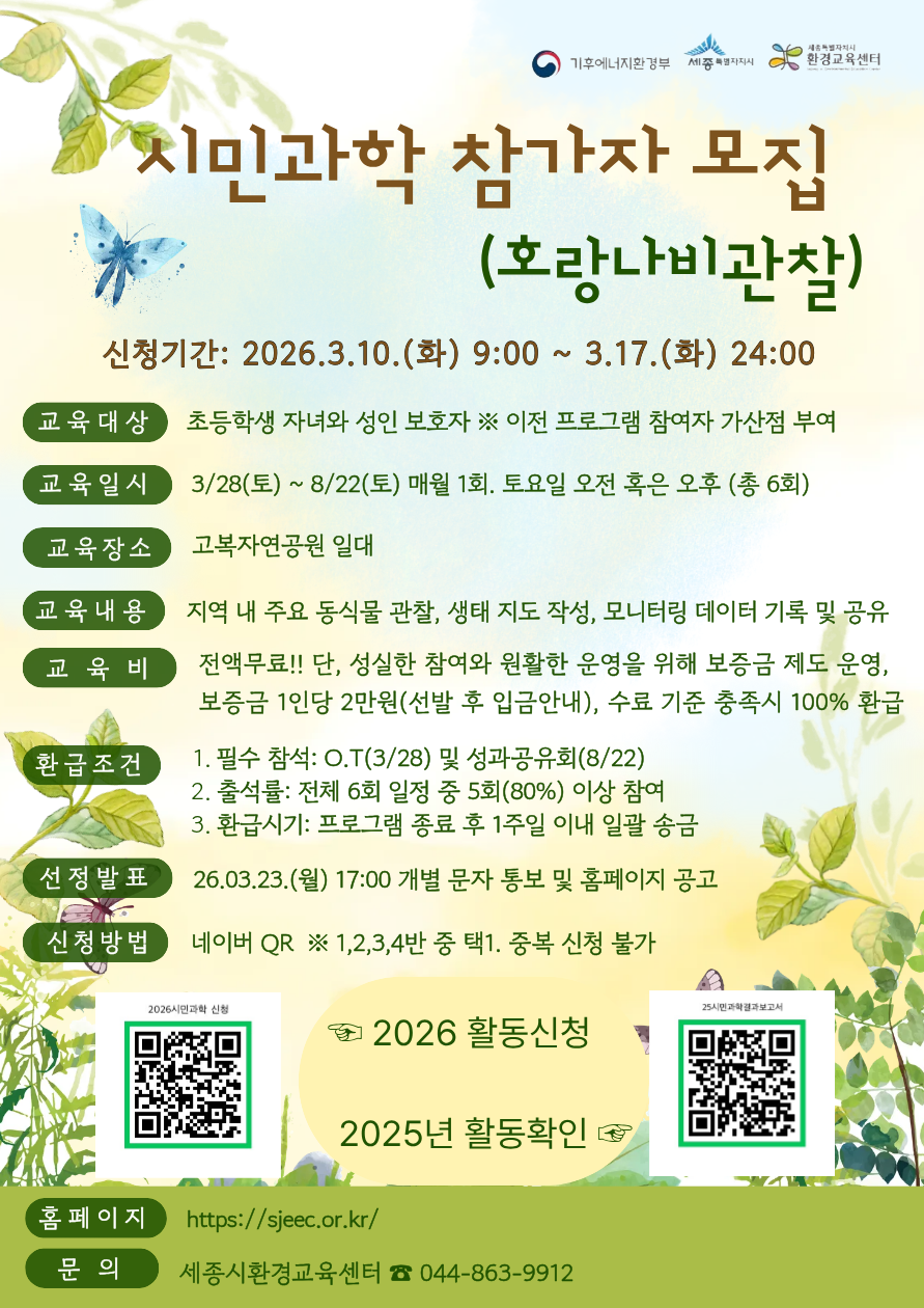 ![]() [모집] 2026 시민과학 '호랑나비 관찰' 참가자 모집 우리 동네 생태계를 직접 관찰하고 기록하는 시민과학자가 되어보세요! 세종시환경교육센터에서 고복자연공원의 아름다운 생태 자원을 함께 지켜나갈 가족을 기다립니다. 🦋 프로그램 안내 활동명: 시민과학 (호랑나비 관찰 생태모니터링) 활동내용: 호랑나비 및 고복자연공원 생물종 데이터 수집, 생태 교육 및 실습 활동기간: 2026년 3월 28일 ~ 8월 22일 (총 6회, 월 1회 토요일) 장소: 세종시 고복자연공원 일대 대상: 세종시 거주 초등 자녀를 둔 가족 (총 4개 반 운영) 보호자 1인 + 자녀 1인(2인 1조) 신청 권장 📅 모집 및 신청 방법 모집기간: 2026. 03. 10.(화) ~ 03. 17.(화) 신청방법: 홈페이지 내 온라인 신청서 작성 https://naver.me/FjmszDqf 선발기준: 참여 동기 및 다짐, 생물 모니터링 경험 등 검토 후 개별 안내(문자) 교육보증금: 1인당 2만 원 (5회 이상 참여 시 100% 환급) 문의: 세종시환경교육센터 (044-863-9912) |