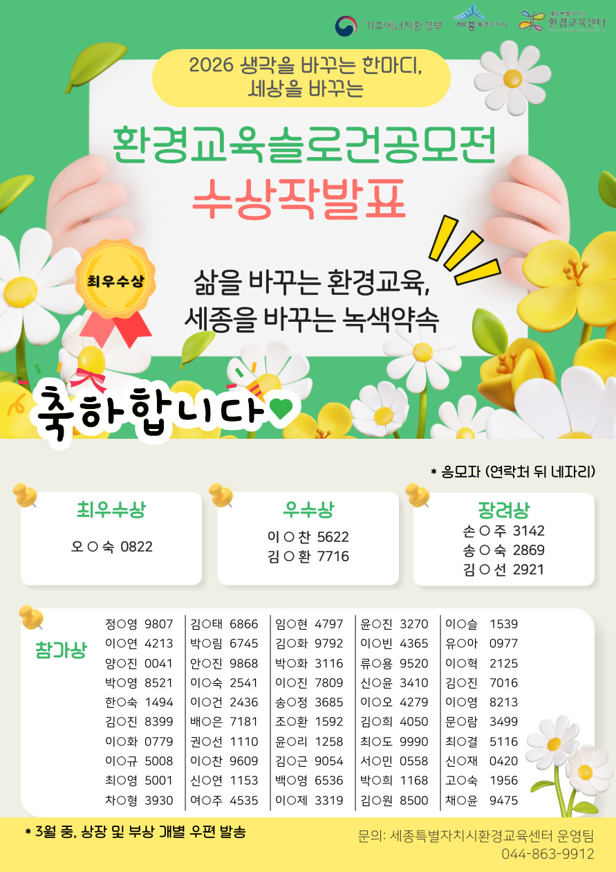| 제목 | 2026 생각을 바꾸는 한마디, 세상을 바꾸는 세종시 환경교육 슬로건 공모전 수상작 발표 | ||