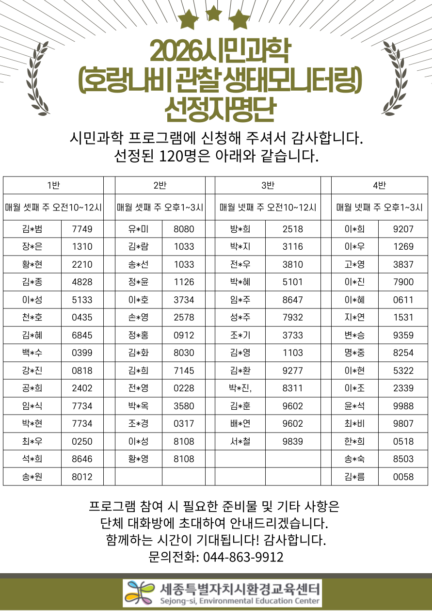 2026 시민과학(호랑나비관찰 생태모니터링) 선정자명단